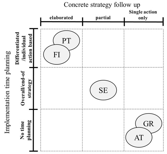 NB: x-axis analysis category “Concrete strategy follow up”: single action only (i.e., no concrete implementation plan/implementation steps foreseen for actions outlined in the strategy; follow up of actions in an ad-hoc and un-systematic way); Partial (i.e., includes some planning aspects such as a financing of actions in the implementation framework); Elaborated (existence of a follow up implementation or action plan of the Strategy); y-axis analysis category “Implementation time planning”: No time planning (i.e., un-specified time plan for action implementation); overall/end-of strategy (i.e., overall but un-differentiated time planning exists for all actions); Differentiated/individual action based (i.e., comprehensive time-planning differentiated among various actions).