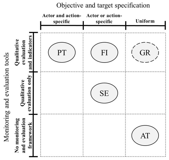 Thus, for the analysis feature “integrated policy learning” (Figure 5), the paper further distinguishes between two conceptually related categories: The availability of overall objectives in combination with measureable targets (“objective and target specification”), providing clear guidance for implementation by means of various “monitoring and evaluation tools”.