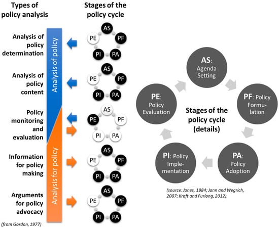 The second level of our framework relates to the stages of the policy cycle, a widely used representation of a policy process evolving through a sequence of discrete stages [18,19,20]. Five stages are often considered in a policy cycle: agenda setting (identification of a problem that deserves attention in the political agenda), policy formulation (dialogue between stakeholders and definition of goals and strategies, as well as an exploration and appraisal of options for addressing the problem), policy legitimation and adoption (decision on a course of action, mobilisation of political support, formal enactment), policy implementation (determination of roles and responsibilities of implementing agencies, allocation of resources), and evaluation (assessment of policy effectiveness in terms of problem-solving and unintended effects) [19,20].