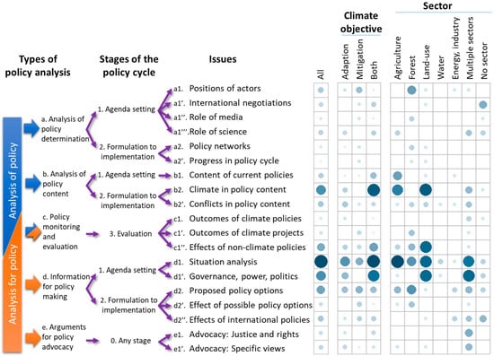 The analysis of research questions in the selected papers led to a typology of 19 main issues related to climate change policies, covering five types of analysis (Figure 2). Seven of these issues dealt with the first stage of the policy cycle, agenda setting. Seven dealt with the phases of formulation, adoption, and implementation. The final three issues referred to the evaluation phase. There was a high number of documents focusing on situation analysis (as part of information for policy making, in the stage of agenda setting) and the integration of climate in policy content (as part of the analysis of policy content in the stages of formulation to implementation) (see issues d1 and b2 in Figure 2).