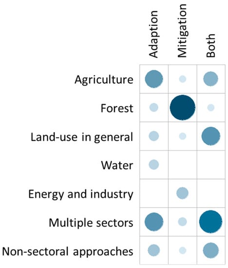 Many of the documents dealt with at least one of three associations of climate objectives and sectors (Figure 3): adaptation in agriculture, mitigation in forests, and both adaptation and mitigation in land-use in general. The focus on these three associations (which will be described in details in Section 3.2) was justified by the vulnerability of agriculture to climate variations, and the emissions caused by deforestation [22]. There was little to no research on other vulnerable sectors (e.g., water or health) or other emitting sectors (e.g., energy and industry) in the context of rural development.
