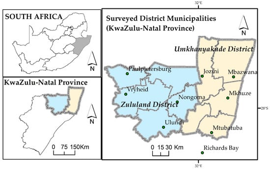 The geographical location of the study area is in the KwaZulu-Natal province of South Africa and is comprised of two district municipalities, namely, Umkhanyakude and Zululand (Figure 1). In terms of population size, KwaZulu-Natal is the second largest (11.1 million) province in South Africa after the Gauteng province (13.4 million) [49]. KwaZulu-Natal province has one metropolitan municipality, 10 district municipalities, collectively subdivided into 43 local municipalities [49]. Although, all district municipalities in the KwaZulu-Natal province have both urban and rural areas, both Umkhanyakude and Zululand District Municipalities are predominantly rural in their land use patterns [50] and were therefore suitable for the present research goal. Whereas Umkhanyakude District Municipality (UDM) has four local municipalities (Big 5 Hlabisa, Jozini, Mtubatuba, and Umhlabuyalingana), Zululand has five (Ulundi, Nongoma, Pongola, Abaqulusi, and Edumbe). Previous research conducted in these areas has mapped the location of illegal dumpsites, and has shown that the proportion of unpermitted disposal facilities is extremely high, with Zululand District Municipality (ZDM) having 83% whilst UDM had 89% [50].