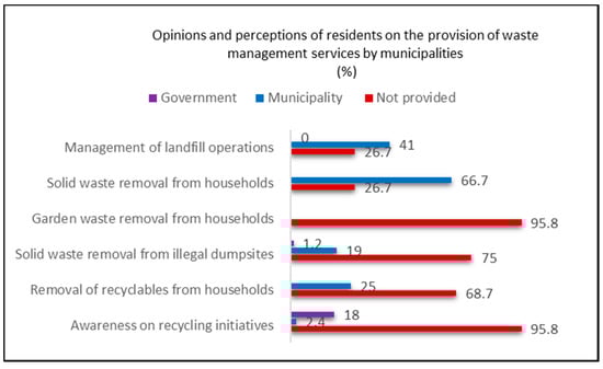 Based on Figure 2, most of the respondents expressed negative opinions and perceptions regarding the extent to which local municipalities provide certain waste management services. For example, services such as creating environmental awareness amongst community residents (n = 319, 95.8%), collection of recyclable materials from domestic premises (n = 229, 68.7%), or solid wastes from informal (i.e., illegal) waste dumps (n = 250, 75%) are not being adequately provided in the surveyed districts. Similarly, garden waste from domestic premises (n = 319, 95.8%) is also not collected by local municipalities. On the other hand, local municipalities were found to be responsible for the collection of domestic solid wastes (n = 222, 66.7%) from households as well as the management of landfill operations (n = 137, 41%).