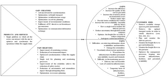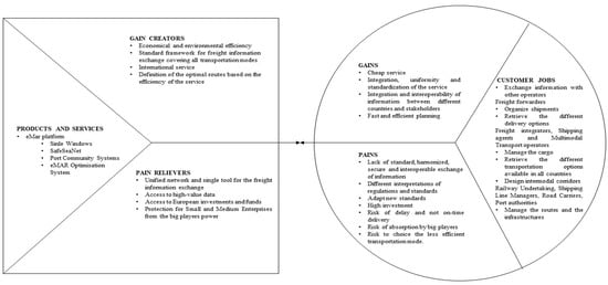 The e-Maritime Strategic Framework and Simulation based Validation (e-Mar) project was a research initiative that ran between 2012 and 2014, in which the 28 participants addressed the topic “Upgraded maritime transport information management” as a part of the European Commission’s 7th Framework Programme. The aim of this project is to support the development of sustainable maritime transport in Europe through the definition of a framework based on the latest information, communication, and surveillance technologies [20]. As shown by Value Proposition Canvas in Figure 2, the main beneficiaries of the e-Mar outcomes are: