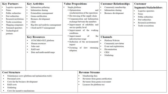 As discussed in Section 3, the innovative feature of the SYNCHRO-NET project is its business approach and product-oriented perspective. For this reason, according to the GUEST methodology, the aim of the Evaluate step was to build a business idea and take the preliminary strategic and operational decisions for the implementation of a commercial viable solution. In fact, from the outcomes obtained in the Go phase, a high-level Business Model Canvas of the SYNCHRO-NET solution is designed. This means that it is the result of a first iteration, while progressive refinements will be included to up as the project development goes along. This approach allows to create an internal consistency in the business model and respect to the stakeholder requirements. Moreover, an innovative feature of SYNCHRO-NET is that the stakeholder-driven approach is not closed to the survey. In fact, the continuous engagement of customers, logistics providers, shipping companies and public authorities is guaranteed by a specific component named Dynamic Stakeholder Impact Assessment Module. This module represents one of the most important innovations in SYNCHRO-NET as it is capable of recording the views of all stakeholders in the supply chain, and to use this information in a controlled way to guide the optimization of the synchro-modal supply chain. In particular, it is composed by the Dynamic Stakeholder Assessment Methodology. It allows to understand the stakeholders preferences over different attributes (e.g., length of route, trip duration, fuel usage, etc.), levels (e.g., measured in kilometers, hours, etc.) and situations (i.e., to rank the importance of different attributes that determine the choice of synchro-modal itineraries).
