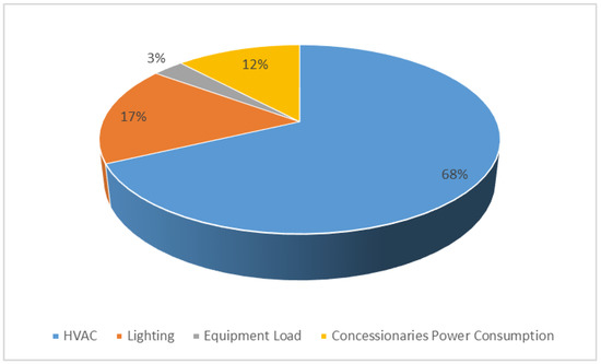 The HVAC system uses the largest share of the energy consumed at terminal buildings, as seen in Figure 2 [9]. Terminal buildings generally have areas and volumes that are too large, and comfort conditions cause higher energy consumption. Thus, HVAC systems must be emphasized in energy efficiency studies of airport terminal buildings. Regarding the quantity of energy consumed for air-conditioning in terminal buildings, the performance of the building envelope also has a very important role, as does the efficiency of the HVAC system.