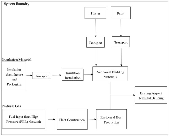 In this study, the system boundaries for the insulating material and natural gas are shown in Figure 5. The system boundary for the insulating material applies to the period from its production at factory to its installation on the terminal building envelope. For natural gas, it includes fuel input from high pressure (RER) network, infrastructure (boiler) and heat production. In addition, the system boundaries for plaster (on the surface where the insulating material will be installed on the wall and on the insulating material after its installation) required for the installation of insulating material and the system boundaries for the paint required for painting of the surface after installation of the insulating material include their production at factory, transfer and installation. Additional building material refers to waterproof membrane used in roof insulation applications. It is assumed that the insulating material has been produced at the largest production plant of Turkey for thermal insulating materials. It is also assumed that the insulating material was transported from the factory to the application area by a lorry and the approximated distance between two points is 250 km. Another assumption has been made regarding the production of the plaster and paint is, they are produced at the closest facility and transportation of such items is done by a lorry on 15 km distance. In this study, the period was taken as 20 years for both economic and environmental effects.