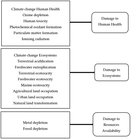 In this study, other environmental effects (HH, DE and RA) were assessed using ReCiPe Endpoint (H) V1.13/Europe ReCiPe H/A. ReCiPe is the advanced version of the Eco-indicator 99 and CML 2002 methods. ReCiPe is used to estimate 17 different midpoint effects, as shown in Figure 6 (these are relatively strong, but difficult to interpret). The endpoint level is formed by the conversion of these 17 midpoint effects to three endpoint categories. These three endpoint categories are the damage to HH, ED and RA [40].
