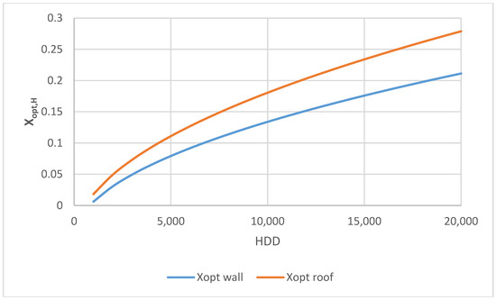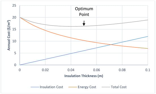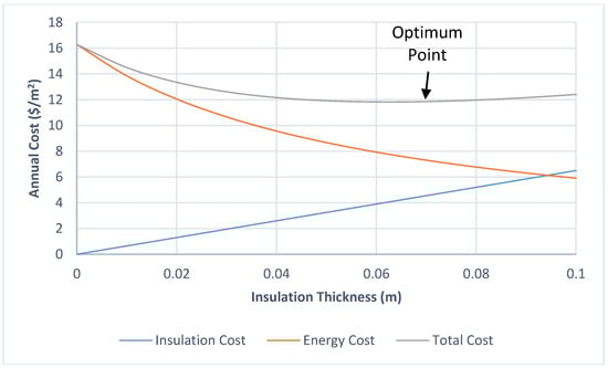 Optimum insulation thickness is calculated by minimizing the heating and cooling costs. Derivatives of Equations (18)–(20), according to were taken, and they were equalized to zero. Thus, the optimum insulation thickness can be found. Optimum insulation thicknesses for heating, cooling and both heating and cooling are calculated in Equations (21)–(23).