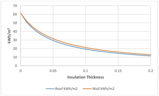 In this section, optimum insulation thickness for the walls and roof was calculated by using the degree-day method. Calculated optimum insulation thickness and PBT are shown in Table 3. Optimum insulation thickness was calculated for only heating, only cooling and both heating and cooling. Figure 7 and Figure 8 show the results. Optimum insulation thicknesses for the walls and the roof were found to be 0.0502 m and 0.0734 m, respectively. Then, the economic payback time (EPBT), depending on the optimum insulation thickness, was calculated. The EPBT for the walls and the roof was calculated to be 6.38 and 7.02 years, respectively.
