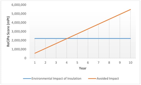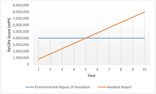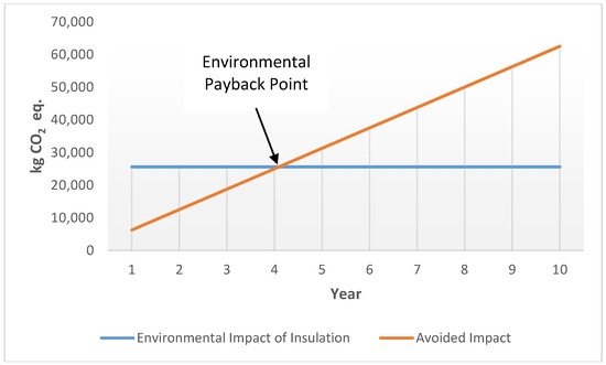 A research examined the environmental payback periods of different insulation materials (EPS, phenolic foam, and mineral wool) by the LCA method and for 16 different environmental impacts [41]. EPS's environmental payback period is shorter than other insulation materials in 14 of these 16 environmental impacts. In both studies, similarly, the environmental impacts of natural gas saved by applying heat insulation were compared and environmental payback periods were calculated. In this study, EPS was chosen as insulation material. However, in contrast, 17 environmental impacts were evaluated over a single score (mPt).