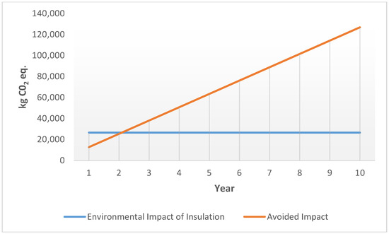 Figure 11, Figure 12, Figure 13 and Figure 14 correspond to the impact of the application of insulation materials and the other required materials on the environment and the case in which these impacts have been avoided are depicted on same figures. Environmental payback point is obtained by dividing the environmental impact of insulation by the environmental impact of the energy saved after application of insulation. This point is the one where the positive environmental impact arising from energy saving balances LCI of insulating material. Environmental payback periods were assessed for the walls and the roof according to IPCC 2013 100a, and they are shown in Figure 11 and Figure 12. GPBT for the walls and the roof were found to be 4.09 and 2.09 years, respectively.