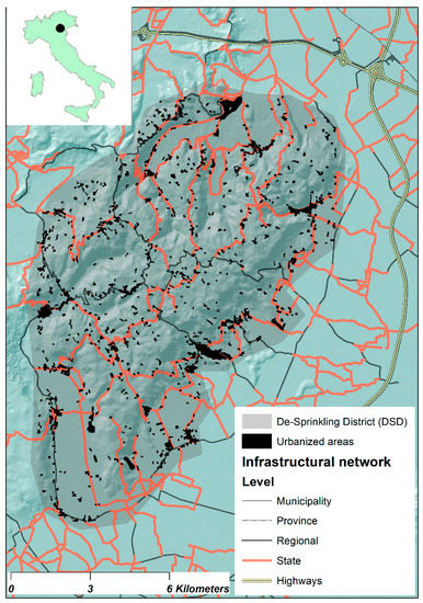 In the experiment illustrated in this paper, the study area (DSD) is located in a North Italian plain–low hill area, distinguished by the extreme dispersive urban model, sprinkling (Figure 1).
