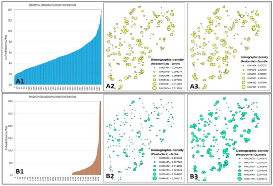 Data distribution of residential demographic density (A1) and productive demographic density (B1). Comparison of classification results: natural break (Jenks) (A2,B2) and quantile distributions (A3,B3).