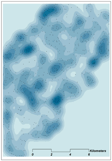The ranking selection (urban ranking index—URI) with kernel density of possible centres on which future actions of urban concentration could be implemented. The darker colour tone corresponds to a greater concentration of urban elements and hence a higher level of “centrality” potential.