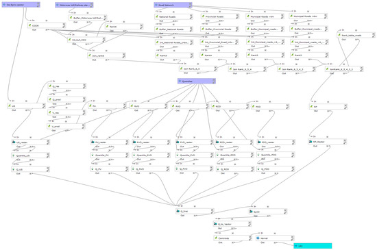 The entire process was designed with a visual programming language for building geoprocessing workflows. With the open source Q-Gis software, it is possible to implement the automated geoprocessing models (processing modeller) and document the spatial analysis and data management processes represented as a diagram that chains together sequences of processes and geoprocessing tools, using the output of one process as the input to another process (Figure 7).