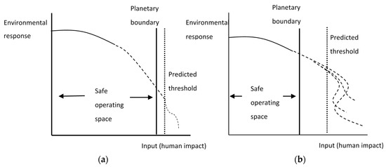 Setting the planetary boundary to define the safe operating space: (a) When past environmental responses (solid line curve) to human impacts are likely to provide a good indication of future responses (dotted line curve), the planetary boundary demarcating the safe operating space (vertical solid line) may be established relatively close to the predicted threshold (vertical dotted line); (b) When past environmental responses (solid line curve) are unlikely to provide a good indication of future responses (dotted line curves), and there is uncertainty over irreversible threshold effects, the desired planetary boundary (vertical solid line) may be set so that the safe operating space is relatively far from the predicted threshold (vertical dotted line).