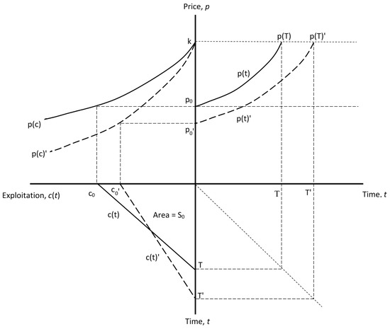 For analytical convenience, we assume that the marginal rate of biological growth of recovery is constant, so that we can denote . This allows Equation (3) to be rewritten as , which yields the following solution for the price path