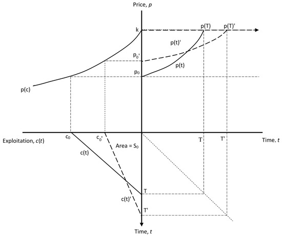 Using diagrams to represent the modeling relationships developed previously, Figure 2 indicates the likely effects of a technological innovation that reduces the demand for exploiting a given safe operating space . The diagram assumes a positive net rate of return , and consequently, is completely depleted in finite time T. The solid lines show the optimal exploitation and price paths before any innovation takes place. The upper right quadrant shows that the price path corresponding to (4), which rises exponentially at the rate ρ to end at the choke price k at time T. The upper left quadrant indicates the inverse demand curve for exploitation , which indicates that exploitation ceases at the choke price. As shown in the bottom left quadrant, given the demand curve and the price path, optimal exploitation must begin at an initial level corresponding to , decline over time, and eventually equal zero at time T when the choke price k is reached.