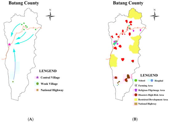 Figure 5A. Besides, there are seven hospitals and 10 schools in Batang town. The religious pilgrimage area, farming area, climate-induced high-risk geological disaster area (divided into four districts according to the dangerousness level) and restricted development area locations in the town are described in the following