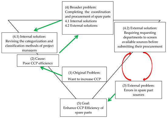 To analyze the research problem, this study adopted the problem hierarchy analysis (PHA) [13]. The problem was expanded, narrowed, and repeatedly analyzed to formulate an efficiency flowchart for the coordination and procurement of spare parts. The flowchart was then used to analyze demand and process descriptions (see Figure 3).
