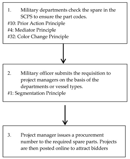 The results of this study showed that the CCP efficiency was increased from 63% to 79% after the TRIZ solution was implemented, yielding an improvement rate of 16%. This improvement in efficiency is directly reflected in the categorization completion rate of planned and unplanned long-term acquisition projects, which are complex and contain extended turnaround periods. However, whether the solution improves the spare part support rate of a requesting department once the procurement project is transferred to the procurement department depends on the procurement process of the procurement department and the performance of the supplier. The coordination and acquisition of spare parts is a long and tedious process in the navy, and the categorization department is only a small segment of the process. Improving categorization is a short-term goal for the navy. The long-term goal is to integrate logistics, coordination, and acquisition procedures into a single, unified supply chain with the requesting departments at the top of the chain to the material reception departments at the bottom. The entire process should be segmented, modulated, and then reconstructed. The TRIZ method can be used to cross-reference and analyze the various operating parameters to greatly improve the existing coordinating and procurement performance of the navy. The methodology and procedures proposed in the present study can be applied to various departments in the future to facilitate them in adapting to the streamlining and organizational reforms of the navy.