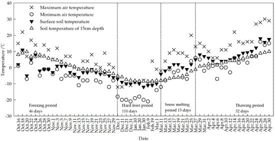 - Tang, J.; Liang, S.; Li, Z.; Zhang, H.; Lou, Y.; Wang, J. Effect of freeze–thaw cycles on carbon stocks of saline–alkali paddy soil. Arch. Agron. Soil Sci. 2016, 62, 1640–1653. [Google Scholar] [CrossRef]