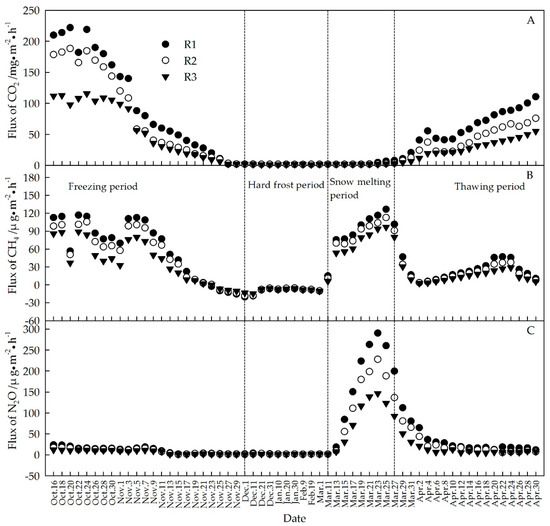 - Zhang, J.B.; Song, C.C.; Yang, W.Y. Cold season CH4, CO2 and N2O fluxes from freshwater marshes in northeast China. Chemosphere 2005, 59, 1703–1705. [Google Scholar] [CrossRef] [PubMed]
