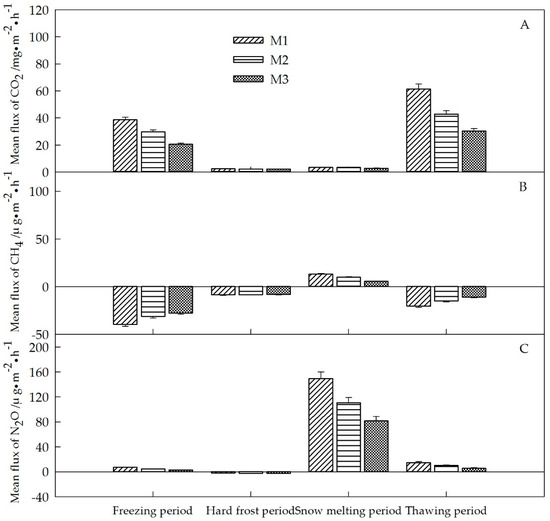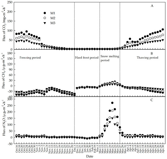 3.3. Mean Flux of CO2, CH4, and N2O during the Different Periods