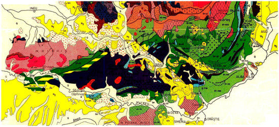 - Săndulescu, M. Geotectonics of Romania; Tehnică Publishing House: Bucureşti, Romania, 1984. (In Romanian) [Google Scholar]
