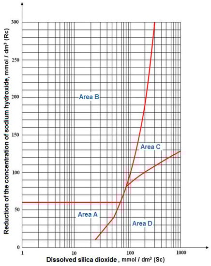 - The quantity of silica dioxide from the filtered sodium hydroxide solution was determined with Equation (2):where: Sc is the concentration of dissolved silica dioxide in mmol/dm3; A1 is the concentration of silica dioxide in g, in 100 cm3 diluted solution; A2 is the concentration of silica dioxide in g, in 100 cm3 witness solution, diluted; and 60.06 is the molecular mass of silica dioxide, in g.