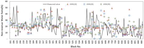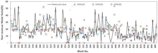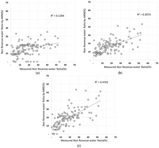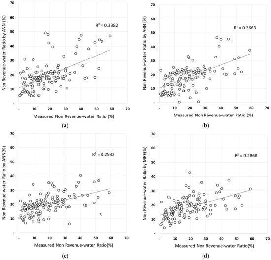 ANN (30) showed the highest accuracy among all results, and ANN (20) of the original data represented the least biased NRW ratio. Figure 7 shows the results of a scatter plot analysis of original data without using the Z-score method. The of the ANN model with 20 hidden layers was 0.3663 and the correlation coefficient was higher than the ANN model with 10 or 30 hidden layers and multiple regression analysis. These are the same results in Table 4 and the ANN model with 20 hidden neurons seems highly accurate.