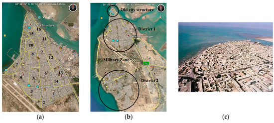 (a) Areas of District 1; (b) Districts of Bushehr City; (c) Old city structure (Source: Google Maps).