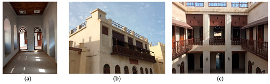 Nowzari edifice—an example of traditional dwellings in Bushehr city; (a) Interior space; (b) shading device (Shenashir) in Northern elevation; (c) open space (central courtyard) (Source: author).