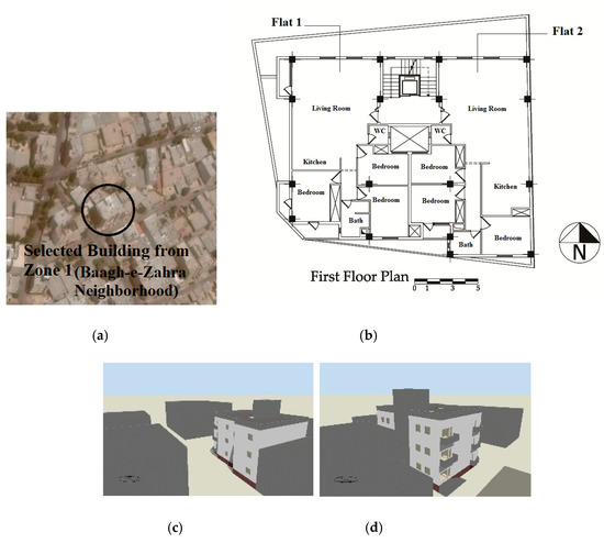 An example of common residential buildings in Bushehr city; (a) location of the case study (building 1) in zone 1, district 1; (b) first floor plan of the case study; (c,d) Southern and Northern view in Design Builder software (Source: author).