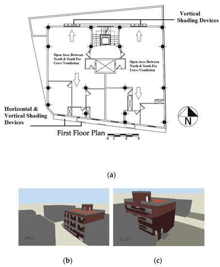 The developed model (building 1a); (a) first floor plan; (b,c) Southern and Northern view in Design Builder software (Source: author).