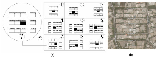 Based on the space layout of the developed model and design criteria presented in Table 2, nine proposed models (including building b1, …, building j1 in Figure 5a) were also designed and modeled in nine different positions for the BagheZahra area, District 1. Table 3 shows an example of the proposed models in position 7. Area description of the models has been presented in Table 4.