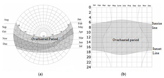 In this study, shading devices were designed based on the shading mask method [53]. Figure 6 shows overheated period on sun-path diagram and yearly shading chart of Bushehr. Since the dimensions of the southern windows were 2 × 3 m, the suitable depth for overhangs was 1 m. The dimensions of the northern windows were 1 × 2 m and therefore, suitable dimensions for side fins were 0.5 × 1 m. For the eastern and western elevations, given the penetration of solar radiation, suitable porous shells were designed.