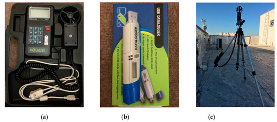 Measuring equipment; (a) wind data logger; (b) temperature and humidity data logger; (c) local weather station on the roof top of building 1.