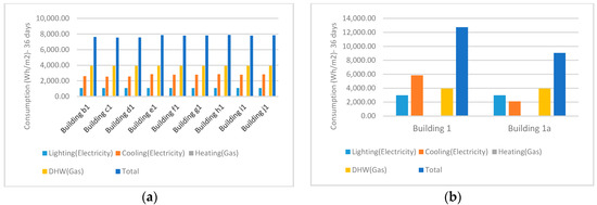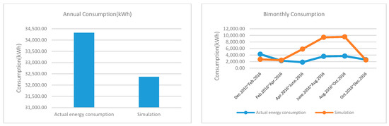 Design Builder software (V.5) was chosen for the purpose of this study based on its established energy performance assessment capability compared with similar energy simulation tools. A comparison between anticipated energy use and actual energy consumption (in Figure 8) as shown on the gathered official bills was done to validate the baseline model (Building 1). The actual energy consumption values on the first floor of Building 1 per year calculated using electricity and gas bills and through simulations were 34,327 kWh and 32,367.15 kWh, respectively, which shows a difference of −6.05% between the actual energy consumption and the simulated consumption. This is within the allowable percentage error.