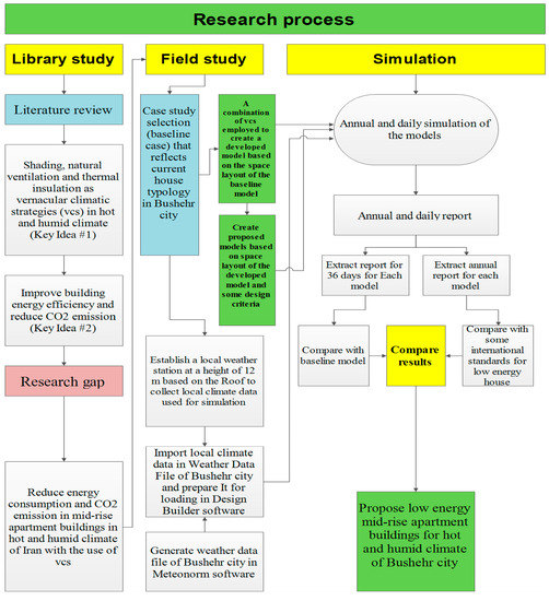 In this study, since the local climate data for three consecutive days per month were used in the weather data file, the simulation results within 36 days/10% of a year will be accurate and reliable. Thus, instead of annual results, the simulation results within 36 days will be discussed for the models. Figure 10 shows the research process diagram.