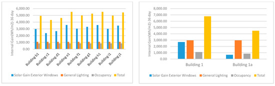 According to Figure 11, in the comparison of Building 1 with Building 1a, given the equal amount of heat generated by general lighting and the insignificant difference in heat generated by occupancy in the two buildings, the total amount of heat generated by the solar gain, occupancy, and general lighting over the selected days (36 days) was reduced from 6777.8 Wh/m2 in Building 1 to 4479.06 Wh/m2 in Building 1a. In addition, in the proposed models, given better day lighting, the equal amount of heat generated by general lighting, and the insignificant difference of heat generated by occupancy, the total amount of heat generated by solar gain, occupancy, and general lighting over the selected days varied from 4312.08 Wh/m2 to 5518.08 Wh/m2, showing a reduction of 1259.72 Wh/m2 to 2465.72 Wh/m2 in comparison with Building 1. This showed a reduction of 20% in total internal gain in Building 1a and from 10 to 22% in the proposed models in comparison with Building 1.