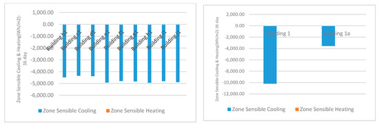 As shown in Figure 12, the total sensible cooling over the selected days was −10196.18 Wh/m2 in Building 1 and −3563.87 Wh/m2 in Building 1a, showing a reduction of 6632.31 Wh/m2 in Building 1a. Sensible heating was excluded due to its insignificant values. In the proposed models, the total sensible cooling varied from −4374.16 Wh/m2 to −4935.01 Wh/m2, showing a reduction from 5261.17 Wh/m2 to 5822.02 Wh/m2 in comparison with Building 1. Sensible heating values were excluded due to insignificance. This showed a reduction of 48% for zone sensible cooling in Building 1a and a reduction of 34–40% in the proposed models, as compared with Building 1.
