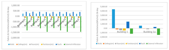 The total heat exchange from the external walls and roof of Building 1 over the selected days without thermal insulation was 4396.45 Wh/m2 and 1546.04 Wh/m2, respectively, which was reduced to 601.42 Wh/m2 and 310.8 Wh/m2 in Building 1a after applying 7 cm and 10 cm of thermal insulation in the external walls and roof. This revealed a reduction of 76% and 66% in the walls and the roof, respectively, in Building 1a. Besides this, in the proposed models, the total heat exchange from external walls and roofs varied from 210.52 Wh/m2 to 273.25 Wh/m2 and 387.63 Wh/m2 to 418.84 Wh/m2, which showed reductions of 4123.2 Wh/m2 to 4185.93 Wh/m2 and 1127.2 Wh/m2 to 1158.41 Wh/m2, respectively, in comparison with Building 1. This showed a reduction of 88–90% for walls and 58–60% for roofs in comparison with Building 1 (Figure 13). The total heat exchange values from ceilings, floors, partitions, and glazing were excluded as they were insignificant.