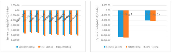 Figure 14 shows total system loads including sensible cooling, total cooling, and zone heating over the selected days. According to this Figure, the total cooling load was −10,500.2 Wh/m2 in Building 1 and −3784.7 Wh/m2 in Building 1a, showing a reduction of −6715.5 Wh/m2 in Building 1a, which represents a 48% reduction in this building. In addition, in the proposed models, the total cooling loads varied from −4553.24 Wh/m2 to −5143.17 Wh/m2, showing a reduction of 5357.03 Wh/m2 to 5946.96 Wh/m2 in comparison to Building 1. This showed a reduction of 34–40% in the proposed models. Zone heating was excluded due to its insignificant values.