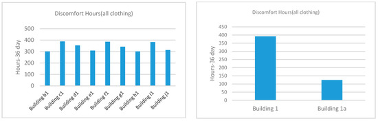 Now, given the total system loads in each model, it could be expected that the thermal comfort would improve in Building 1a and the proposed models and cooling energy consumption would decrease. Figure 15 shows that the total number of discomfort hours over the selected days in Building 1 was 392.3, which was reduced to 124.09 h in Building 1a. This means a reduction of 52% in Building 1a. In addition, total discomfort hours in the proposed models varied from 301.16 to 388.89 h, showing a reduction of 3.41 to 91.14 h in comparison with Building 1. This means a reduction from 0% to 14% in the proposed models.
