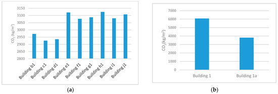 Figure 16 shows total energy consumption over the selected days in each model. Heating energy consumption was excluded due to its insignificant values. Accordingly, given the equality of energy consumption for general lighting and domestic hot water in Buildings 1 and 1a, the total energy consumption was 12,737.59 Wh/m2 in Building 1 and 9044.71 Wh/m2 in Building 1a, showing a reduction of 3692.88 Wh/m2 in Building 1a. In addition, given the equality of energy consumption for general lighting and domestic hot water in the proposed models, the total energy consumption varied from 7543.8 Wh/m2 to 7873.36 Wh/m2 in the proposed models, showing a reduction of 4864.23 Wh/m2 to 5193.79 Wh/m2 in comparison with Building 1. As a result of the reduction in total energy consumption in the developed and proposed models, the CO2 emissions were reduced by 2260.84 kg in Building 1a and by 2948.53 kg to 3147.49 kg in the proposed models in comparison with Building 1 (Figure 17). The results showed a 16% reduction in total energy consumption and a 22% reduction in CO2 emissions of the developed model. In addition, a reduction of 24–26% was also observed in total energy consumption and 32–34% in CO2 emissions of the proposed models.