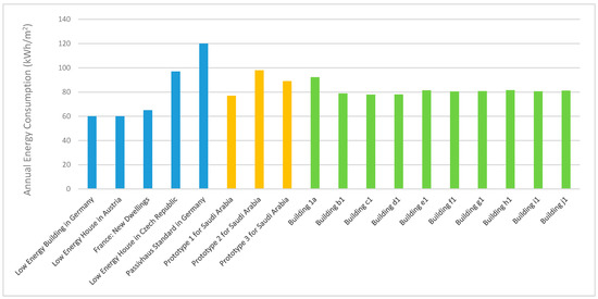 Many developed countries have established a standard of energy use based on their needs and local climate conditions [40]. At present, seven European Member States have adopted a working definition of a low energy house. These definitions are most often applied to new houses, but also cover existing houses and can usually apply to both residential and non-residential buildings [40]. Furthermore, Aldossary et al. [40] proposed three low energy prototype houses (low-rise) that reflect current house typology and space layout in Saudi Arabia. Based on their findings, a domestic energy performance reference was proposed with energy consumption ranging from 77 kWh/m2 to 98 kWh/m2 for Saudi Arabia and the wider Middle East region.