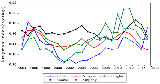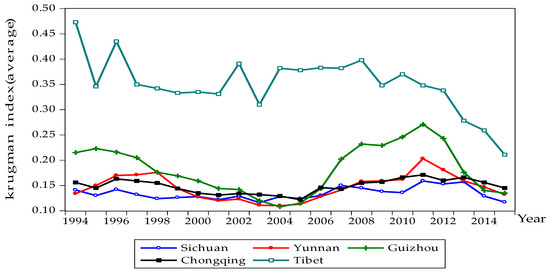 Figure 1 shows that there is almost no difference for GDP per capita in the 12 western regions in 1994. There is a slight growth from 1994 to 2000. After 2000, there is a significant increase in GDP per capita, mainly due to the Western Development Strategy aiming at western economic growth. The fastest economic growing region is Inner Mongolia, Specifically, GDP per capita in both Guizhou and Gansu are the lowest two in 2014; meanwhile, Guizhou has been the lowest before 2014. In addition, on GDP per capita in 2015, there are three regions varying from 20,000 to 30,000, four regions between 40,000 and 50,000, one region between 50,000 and 60,000, and one region over 70,000. It is easy to observe that there is a gradually increasing difference within 12 regions. Thus, it is a practical need to analyze the influencing factor of regional economic difference, such as the long- or short-term impacts of Western Development Strategy. Figure 2 shows that southwestern China lists at the end of GDP per capita, which should become the focus of future economic development difference. The dynamic trend of Krugman indices is shown in Figure 3.