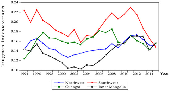 Krugman index comparison of southwestern, northwestern China, Inner Mongolia and Guangxi.